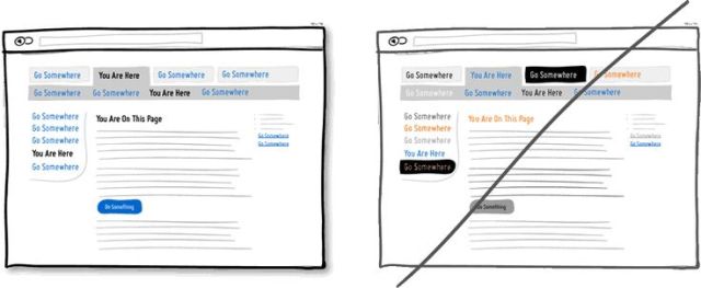 應用視覺元素之手法可以幫助使用者了解頁面上的功能與結構,例如顏色、深度與對比度等。同時為了與你的使用者精準的溝通,需點擊的行為(如連結或按鈕)與需選擇的元件(如選單)設計上要有所區別,同時上方的文字必須描述清楚,才有利使用者辨別。在底下的例子中,作者選擇了藍色做為網站上使用者可點擊元件的主色,而黑色為標示已選擇的項目或是現在頁面的名稱,簡單明顯的顏色應用,讓使用者藉由顏色的線索更輕易的學習和使用網站功能。最后請記得,千萬別使用難以辨識或過多的顏色混淆使用者。