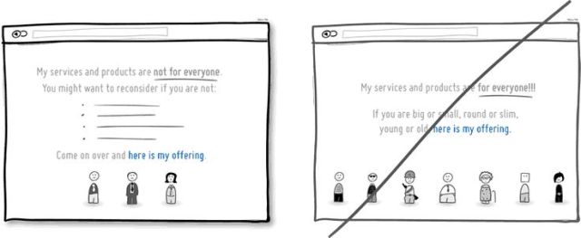 描述或限制適合產品或服務的目標族群,可以幫助網站找到更多相似特質的使用者,也更具特色,同時讓使用者感到自己具獨特性。然而,使用這樣策略具有風險,可能讓你的網站在短期內失去一些潛在用戶。不過,透明與誠實才是建立與使用者之間信任的最佳方式。
