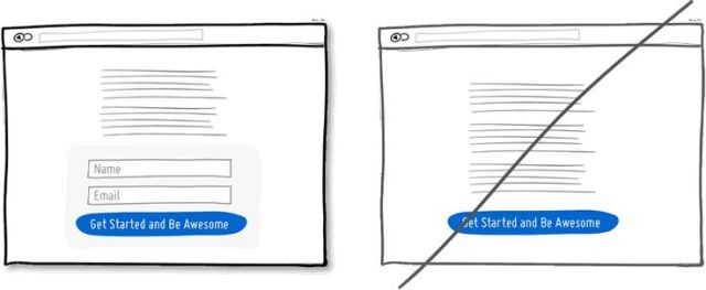 當頁面上有一些我們期望使用者做,并會帶來價值的功能時(例如留下聯絡方式),最好可將實際的表單或欄位放置于本頁上。如下圖,欄位若能與頁面整合在同一層,其帶來的好處大于還要連結至別頁輸入的方式。